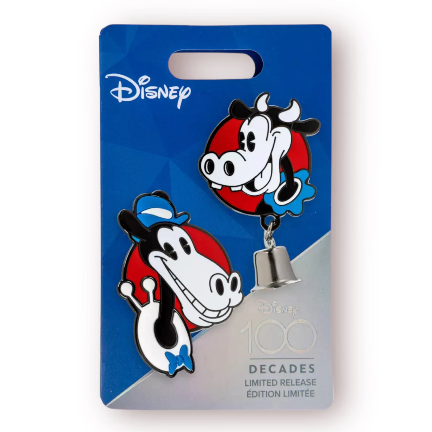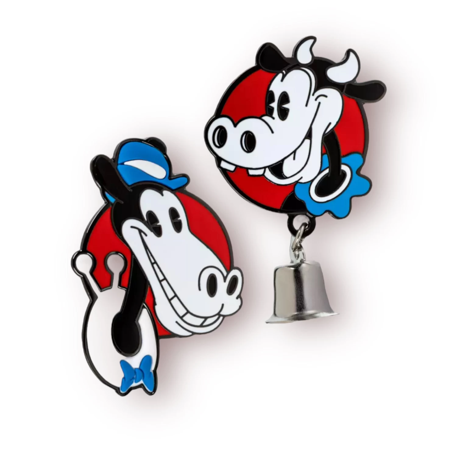 You’ll want to throw a barn dance or a ”whoopee” party in celebration of classic cartoon co-stars Clarabelle Cow and Horace Horsecollar–not to mention Disney’s 100th anniversary celebration–with this set of two cloisonne pins from the golden age of animation.