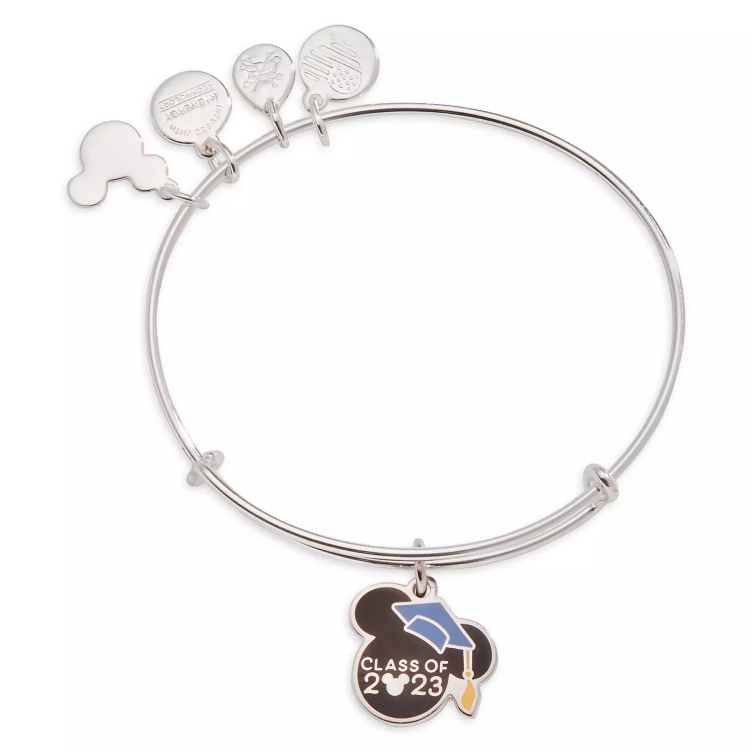 Celebrate ”The class of 2023” with this graduation ear hat bangle from Alex and Ani. The adjustable silvertone bracelet features an enamel cloisonné Mickey icon mortar board charm to commemorate your scholastic success.