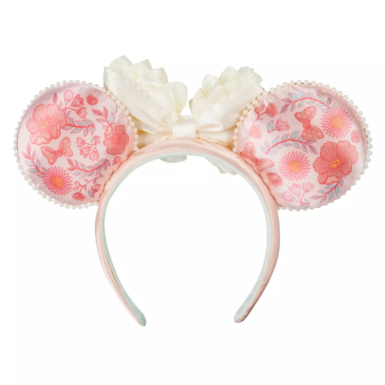 Prepare to dazzle in this Minnie Mouse ear headband with Regency Ruffles. With its ruffly satin bow, pretty embroidery and pearl trim, this elegant headband shimmers and shines with the romance of another era. The velvet lining assures that it is as comfy as it is gorgeous.