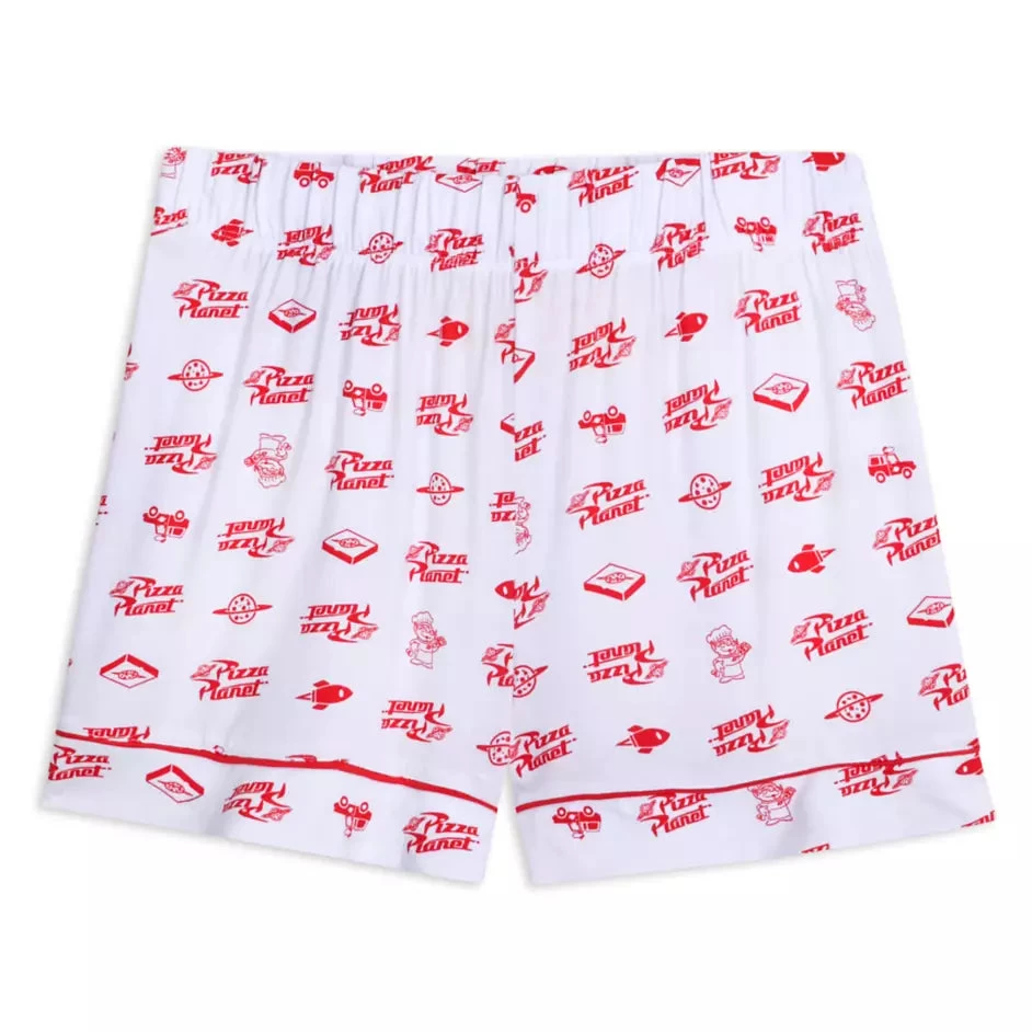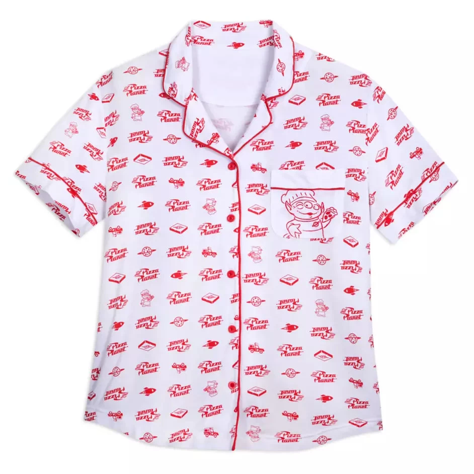 Cute and cuddly, this Pizza Planet sleep set really delivers when it comes to adorable style and soft comfort. The two-piece set has an allover print of Pizza Planet icons including a Space Alien ”pizza chef” who also appears on the chest pocket. With a short sleeve button front top and elastic-waistband shorts, these pajamas blend classic and modern styling for a look that’s out of this world.