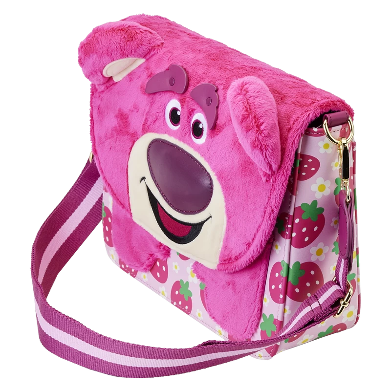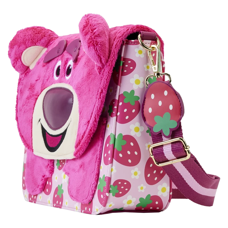 There’s nothing better than a bear hug! This soft and cuddly teddy is ready to accompany all your adventures as the exclusive Loungefly Toy Story Lotso Plush Berry Strap Crossbody Bag. Taking shape on the bag’s front flap, Lotso Huggin’ Bear comes to life with fuzzy plush details and a yummy strawberry scent that accompanies his velvety nose. Look closely and you’ll see his moveable eyebrows take a menacing turn. Down below, Lotso’s arms dangle above a cheery strawberry motif. A berry-colored shoulder strap features a strawberry on each end, making sure that your furry friend will never get lost. Perfect for playtime, this adorable accessory will stay by your side through thick and thin. Act fast to collect this exclusive Loungefly accessory; supplies are limited.