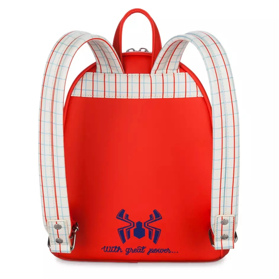 Spider-Man shows his soft side with this mini backpack from Loungefly. The front is covered in a synthetic cream sherpa with an embroidered Spidey mask appliqué. This is combined with a red, white, and blue grid design, while the red simulated leather back features a Spider logo with the opening words of the super hero’s iconic slogan: ”With great power . . .”